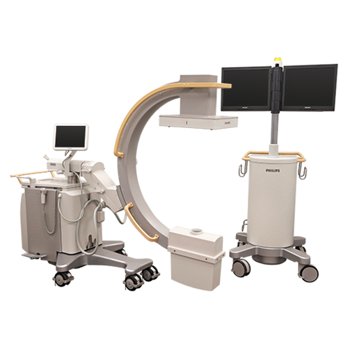 The Philips Veradius C-arm delivers high-quality imaging for guidance and positioning during diagnostic, interventional, and surgical procedures for both adult and pediatric patients. Designed for use both inside and outside the operating room, it is ideal for applications in orthopedics, neurology, abdominal surgery, vascular interventions, thoracic procedures, and cardiac care. This mobile C-arm features a rotating anode and a built-in beam filter to reduce radiation dosage, enhancing patient safety.