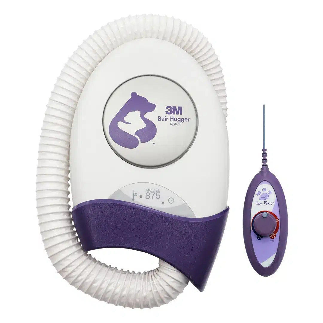 The 3M Bair Hugger 875 patient warmer is designed to help maintain patient comfort and body temperature before and after surgical procedures. This forced-air warming system works with compatible Bair Hugger patient warming gowns to deliver a controlled flow of warm air throughout the garment. Adjusting the temperature and airflow using a handheld controller is easy, allowing personalized comfort during the warming process. The unit is lightweight and compact, making it easy to mount on a wall, IV pole, bedrail, or other nearby surface. With quiet operation and simple controls, the Bair Hugger 875 supports efficient patient warming in preoperative and postoperative care areas.
