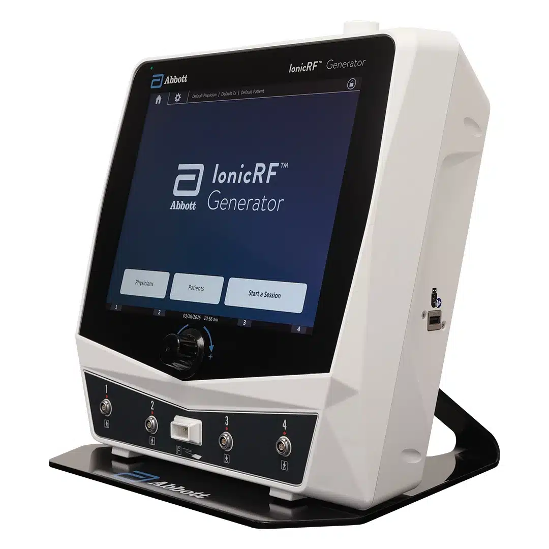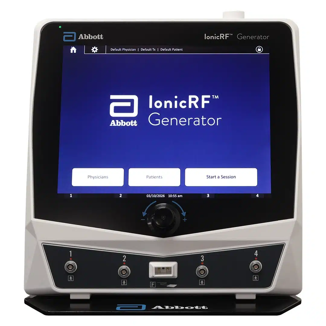The Abbott IonicRF Generator is a radiofrequency system designed to assist physicians in managing chronic pain through targeted neural tissue lesioning. Used with compatible cannulae and electrodes, the generator delivers controlled RF energy to specific nerves during pain management procedures. The system includes built-in sensory and motor stimulation features that help clinicians confirm accurate electrode placement before treatment begins. Its touchscreen interface provides a clear, user-friendly system while also supporting procedure monitoring and data management. Compact and portable, the generator can be used on a countertop or mounted to a compatible roll stand, making it well suited for pain management and interventional procedure suites.