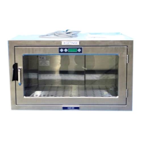The Getinge 5524 Warming Cabinet is designed for the warm storage of saline solutions or blankets used in the care of patients in areas such as surgery, recovery, OB/GYN, ICU or ER. A unique table top warming cabinet with a “look-in” tempered glass door into its convection heated chamber. Temperature range is adjustable from 90°F (32°C) to 160°F (71°C) and is provided with a “lock-in” feature to prevent unauthorized changes to the temperature setting.
