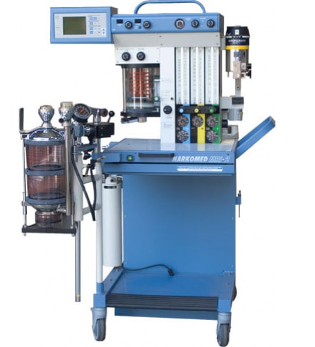 The Narkomed MRI is a magnetic resonance imaging anesthesia system. The unit utilizes the reliable AV2+ ventilator, a single vaporizer mount for 19.1 style vaporizers and the CORm volume, pressure and oxygen monitor on first generation units. The second generation units have Drager GS type display with volume, pressure and oxygen monitoring. The absorber assembly has the familiar Narkomed feel but is MRI compatible version. Units were made from 1996 to present. Units are small and have been tested near the strongest magnets.