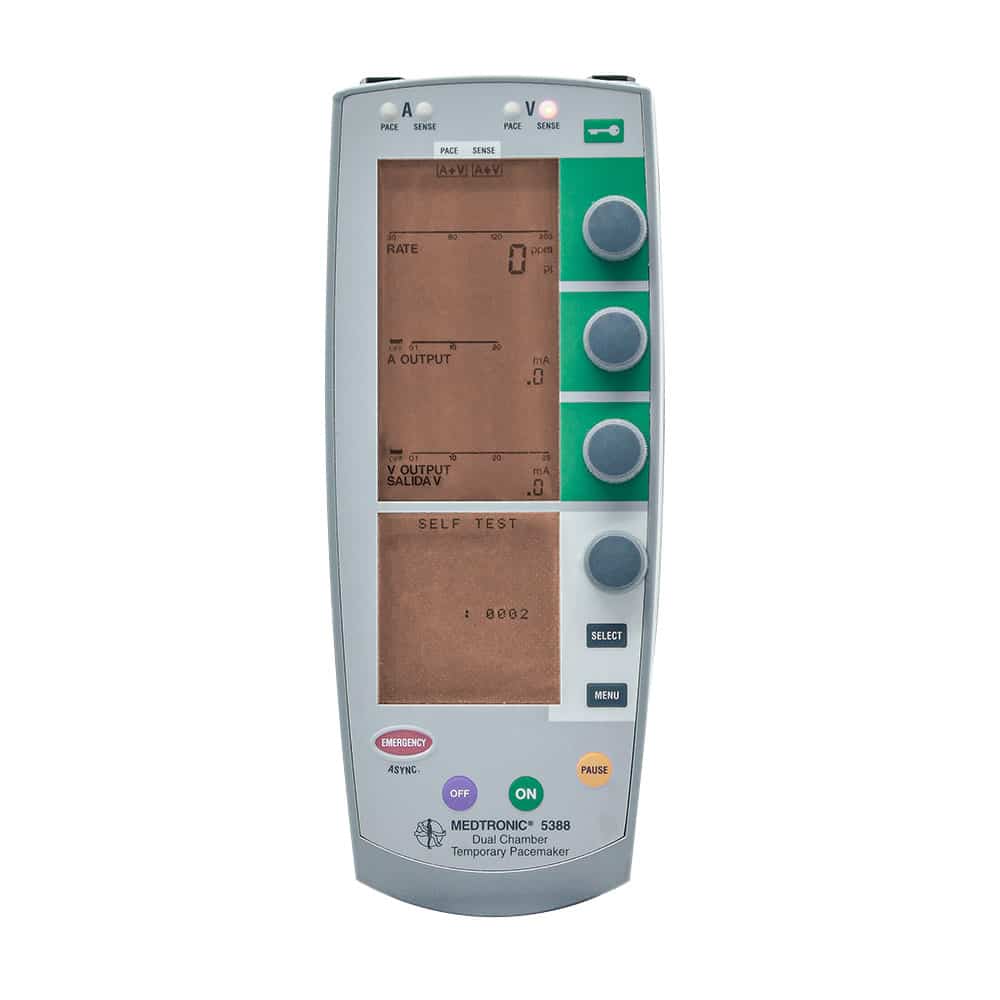 El Medtronic 5388 es un marcapasos externo temporero de doble cámara que ofrece ocho modos de estimulación. Funciona con batería y normalmente se conecta a electrodos transvenosos, epicárdicos o miocárdicos. Es adecuado para la estimulación temporal de una o dos cámaras y proporciona impulsos constantes gracias a su funcionamiento en corriente constante. Medtronic también ofrece otros marcapasos de doble cámara, como el Medtronic 5392.