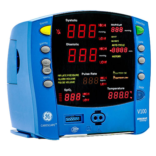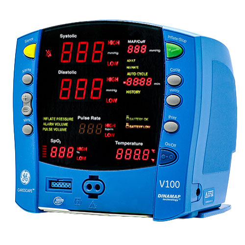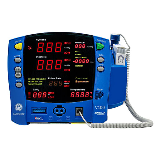 El GE Carescape V100 es un monitor de paciente que mide los signos vitales. El monitor de signos vitales del paciente Carescape V100 puede utilizarse para pacientes adultos, pediátricos y neonatales. El monitor puede medir spO2, NIBP y la temperatura del paciente. El diseño duradero del monitor junto con las ocho horas de duración de la batería hacen que el monitor sea ideal para el transporte, la movilidad y puede utilizarse como monitor de cabecera continuo. El GE Dinamap Carescape V100 ofrece una lectura precisa en 14 segundos de la presión arterial no invasiva.