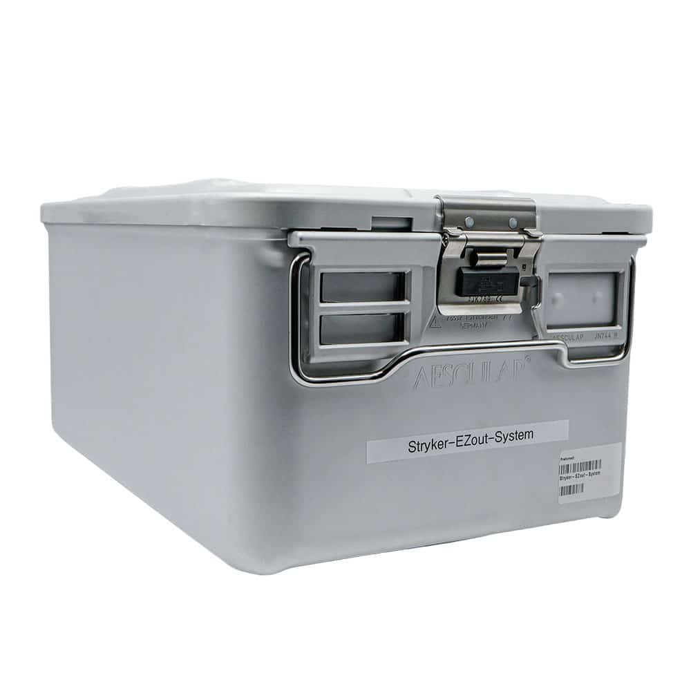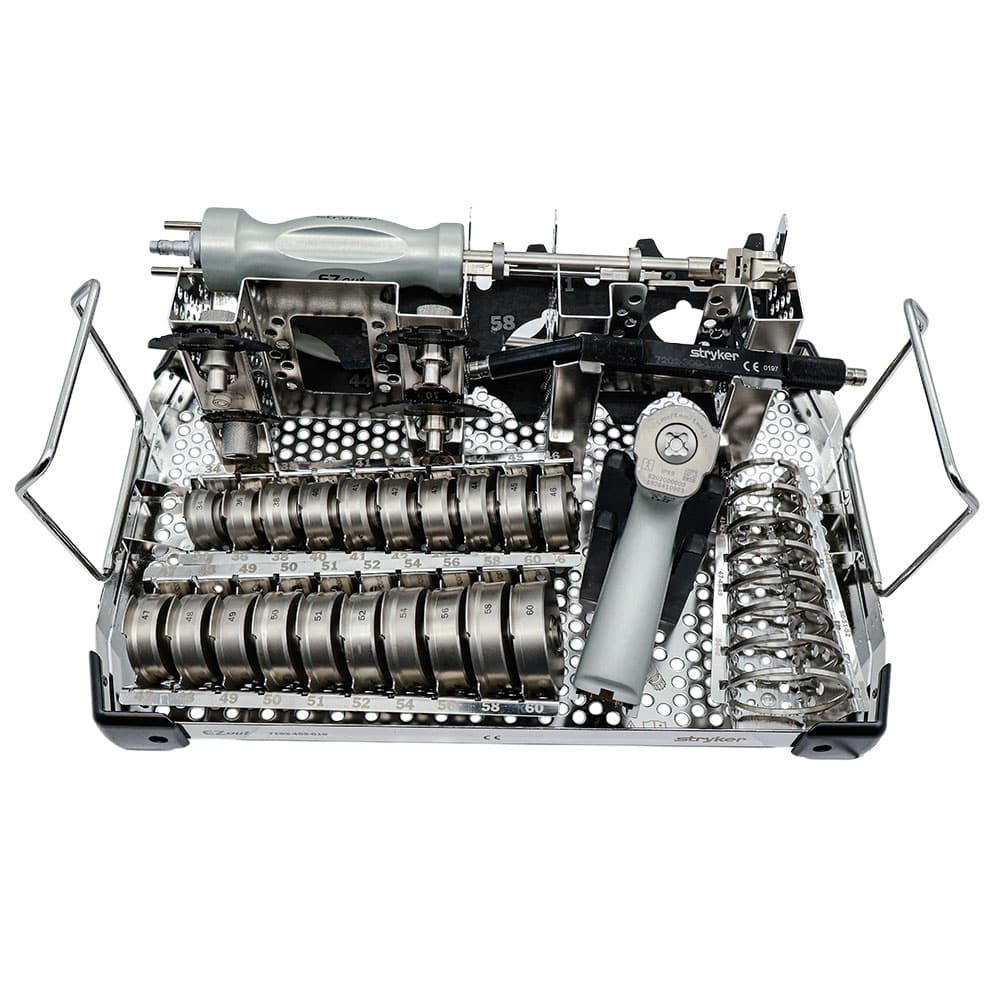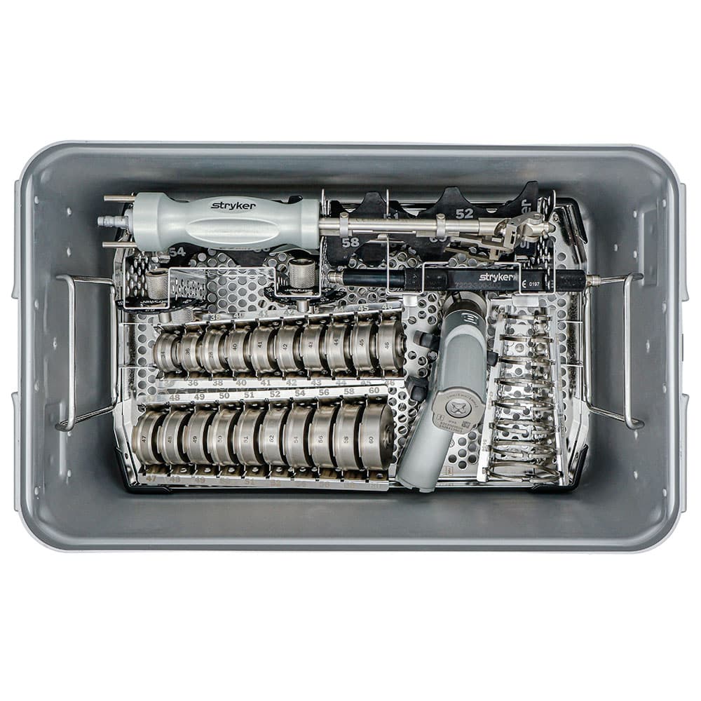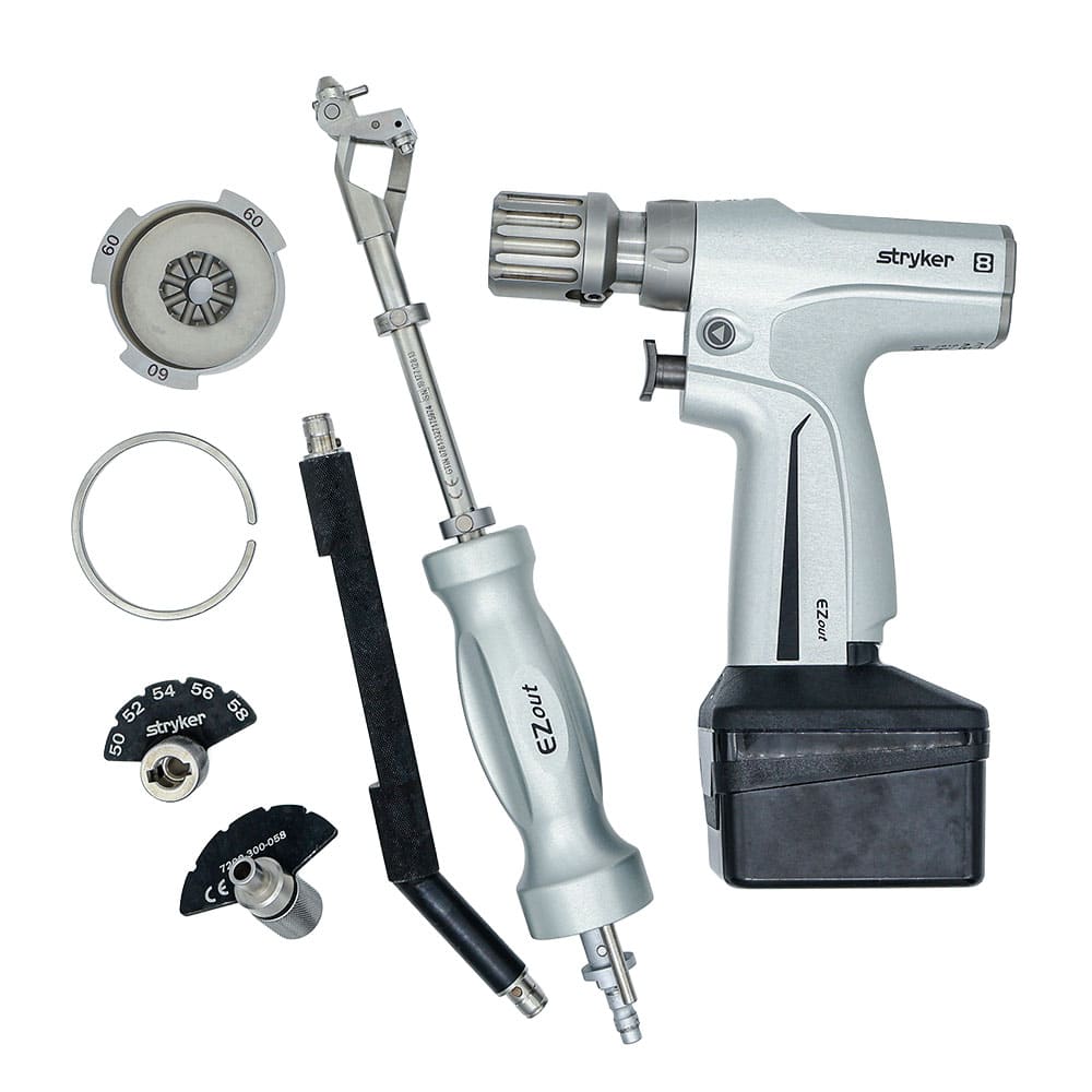 The Stryker System 8 EZOut is a specialized powered surgical device designed for precise and controlled removal of acetabular cups during hip revision surgeries. It replaces traditional manual tools like osteotomes and hammers with an oscillating saw blade, which helps reduce surgeon effort and enhances procedural consistency. The system is built to minimize bone stress, preserve bone stock, and fit into small surgical spaces, making it suitable for all approaches, including minimally invasive (MIS) and direct anterior techniques. It includes a comprehensive kit with various sizing tools, centering plugs, and blades to handle different cup sizes, ensuring customized and predictable results for each patient.